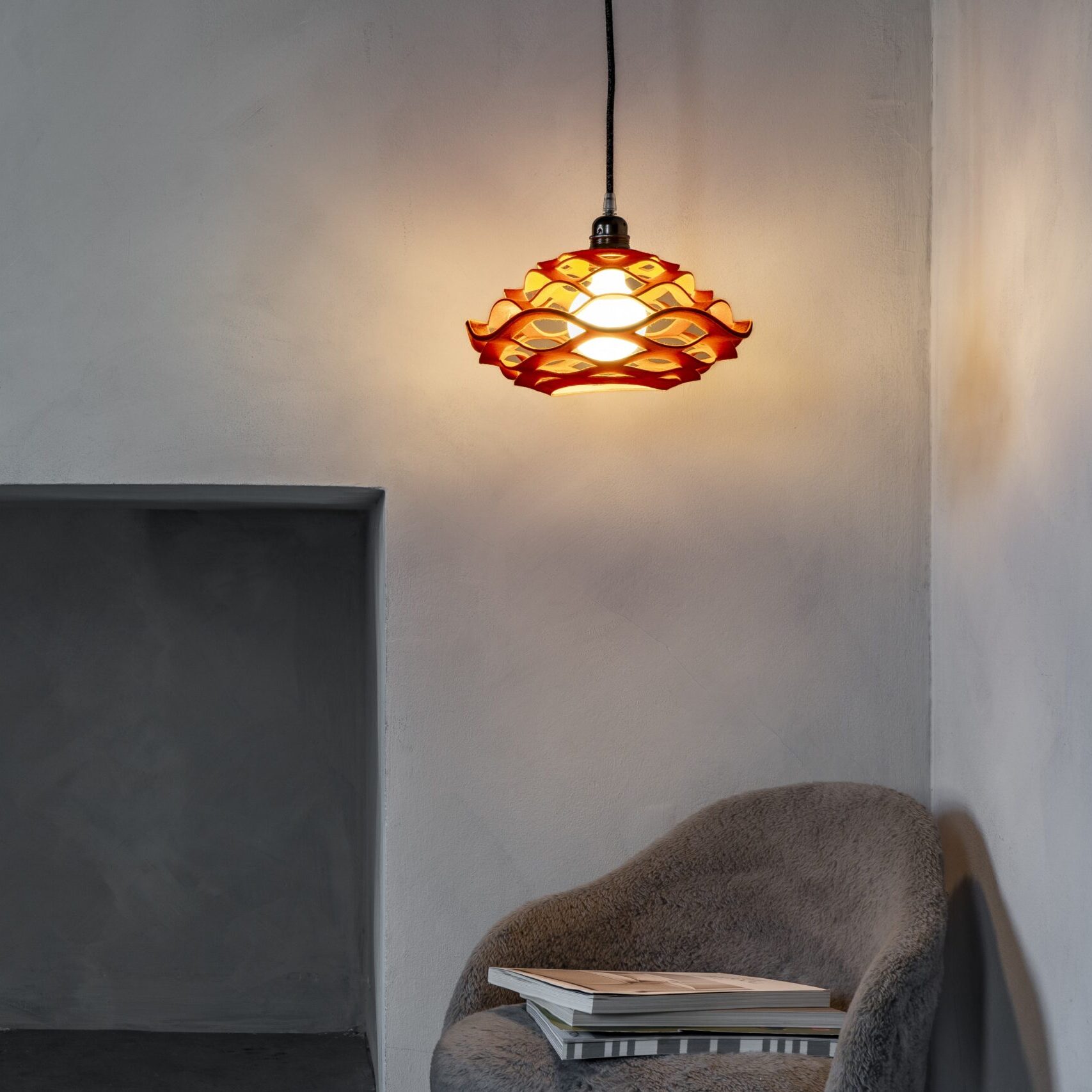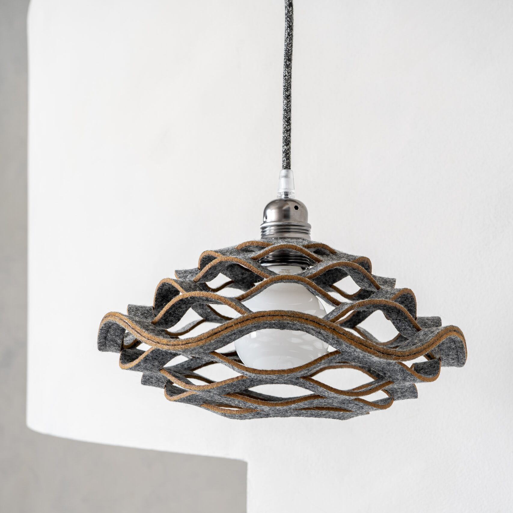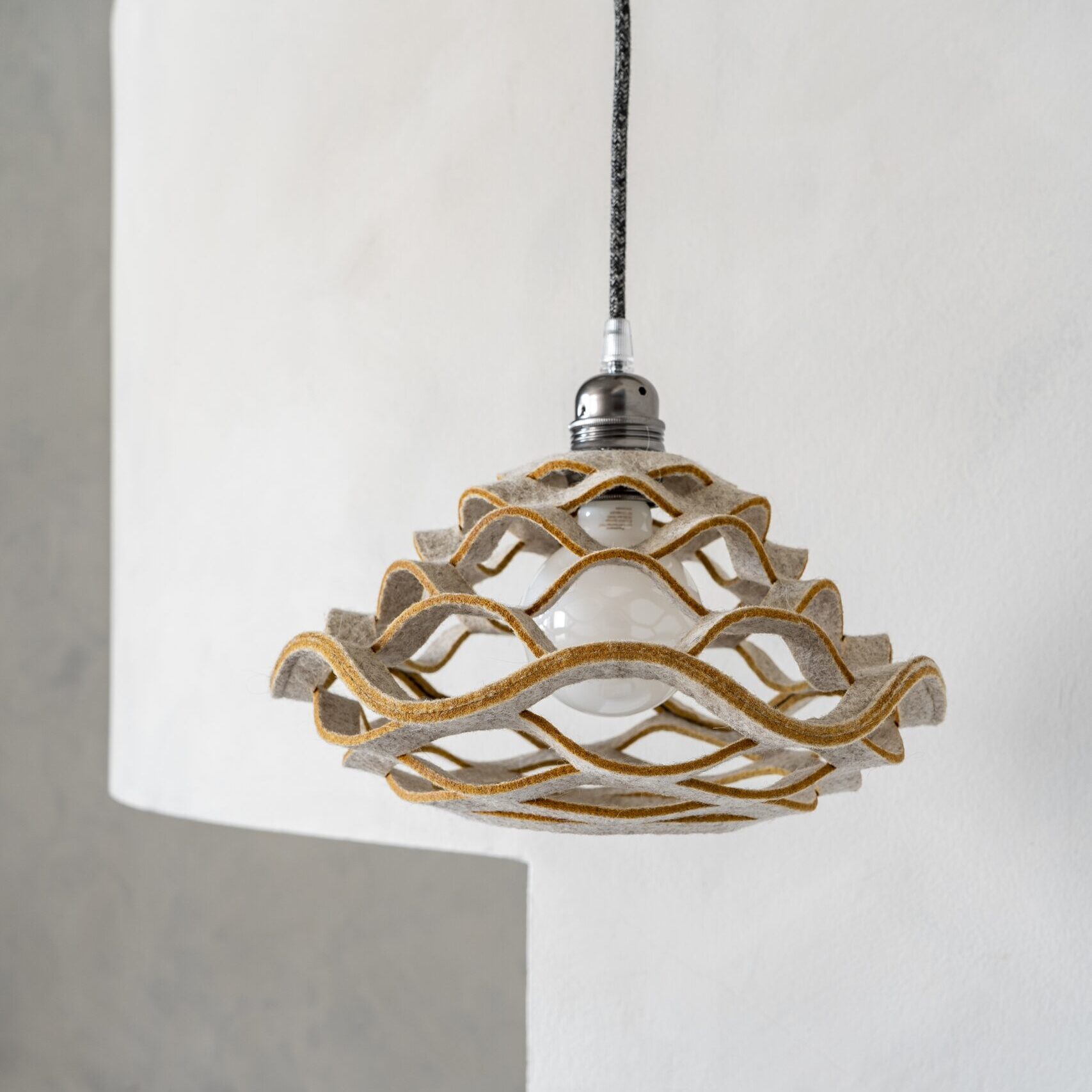 A flower shaped pendant lampshade that once installed ‘grows’ under gravity into its final plump shape. Bloom is made from naturally dyed wool felt and is supplied with all necessary accessories for easy installation. Sheep wool felt is a natural planet-friendly material, that is renewable, long-lasting and bio-degradable.
